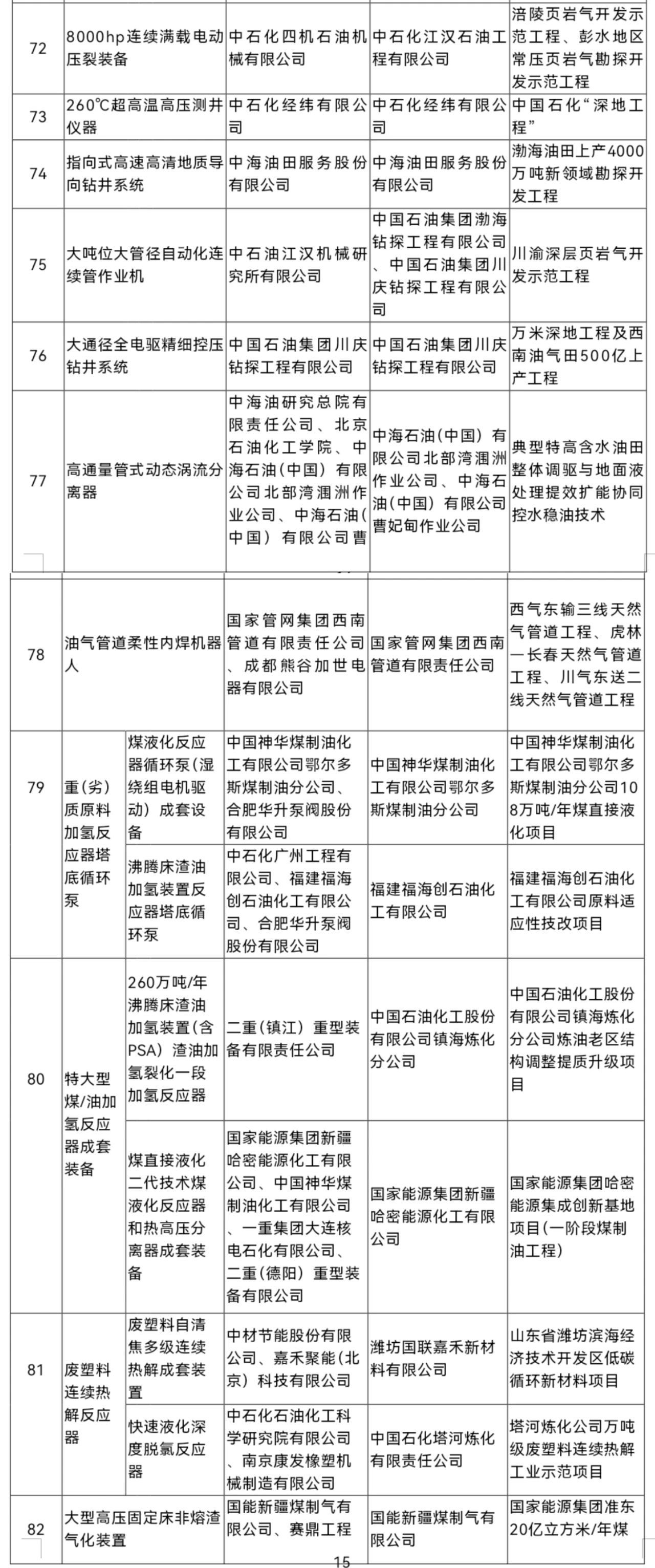 其中,在能源化工領(lǐng)域,中石化、中石油、中海油、國家能源集團(tuán)等企業(yè)的多臺套技術(shù)裝備入圍名單。具體見下表: