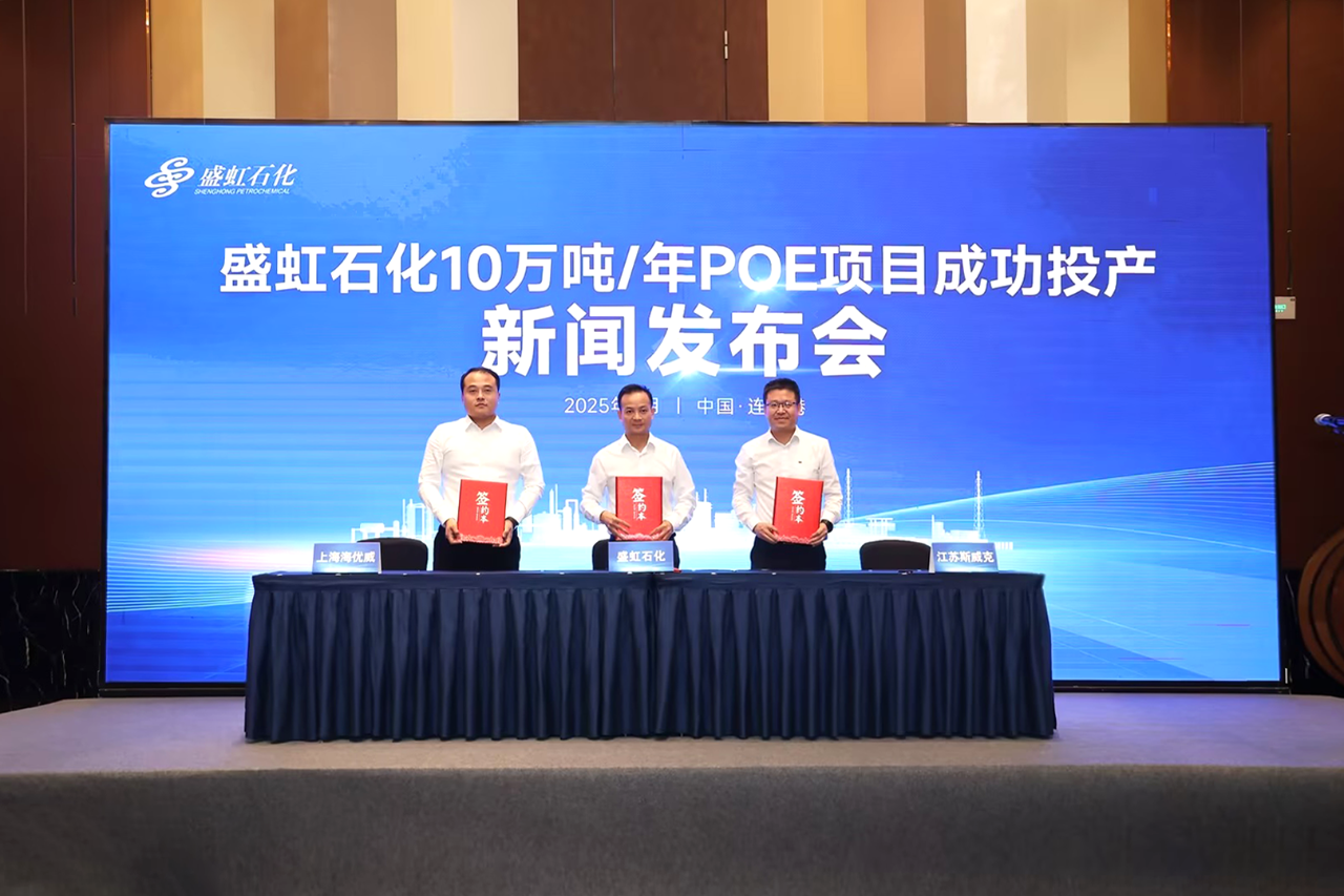 9月4日,盛虹石化10萬噸/年POE項目成功投產新聞發(fā)布會暨長期供貨戰(zhàn)略合作簽約儀式在江蘇連云港舉行,首批320噸優(yōu)等產品同步發(fā)車交付。