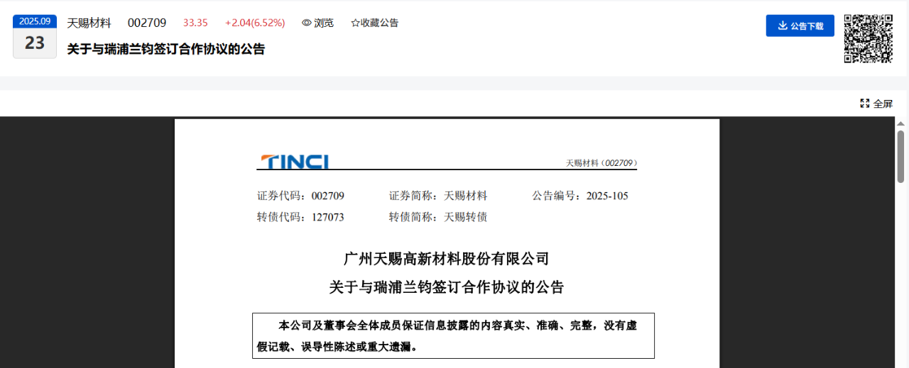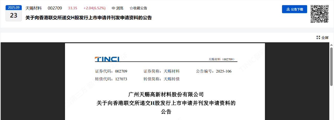 天賜材料于9月23日發(fā)布2條公告。其中一條公告為,公司向香港聯(lián)交所遞交H股發(fā)行上市申請(qǐng),另一條為與瑞浦蘭鈞簽訂合作協(xié)議的公告。