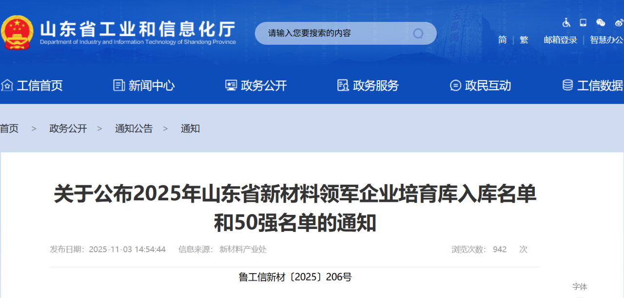 山東省工業(yè)和信息化廳于2025年11月3日正式公布2025年山東省新材料領(lǐng)軍企業(yè)培育庫(kù)入庫(kù)名單及新材料領(lǐng)軍企業(yè)50強(qiáng)名單,旨在健全優(yōu)質(zhì)企業(yè)梯度培育體系,加快培育新質(zhì)生產(chǎn)力,提升全省新材料產(chǎn)業(yè)核心競(jìng)爭(zhēng)力。