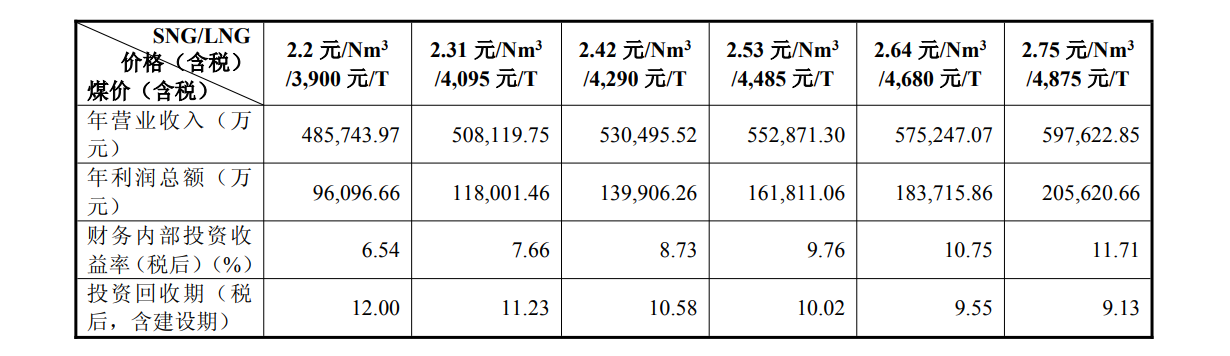 項(xiàng)目經(jīng)濟(jì)效益評價(jià):按照項(xiàng)目建設(shè)期3年,第4年投產(chǎn)且生產(chǎn)負(fù)荷達(dá)到80%,第5年達(dá)產(chǎn);項(xiàng)目經(jīng)濟(jì)服務(wù)年限為15年,所得稅率25%,年生產(chǎn)121428萬Nm³合成天然氣(SNG)、58.2672萬噸液化天然氣(LNG),按照煤價(jià)150元/噸—160元/噸(含稅,燃料煤150元/噸、原料煤160元/噸)測算,在不同的SNG/LNG銷售價(jià)格時(shí),募投項(xiàng)目的財(cái)務(wù)內(nèi)部投資收益率(稅后)為6.54%—11.71%,投資回收期(稅后,含建設(shè)期)為9.13年—12年。